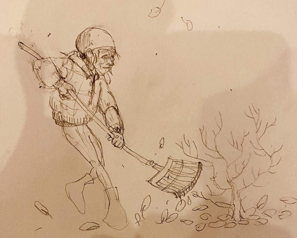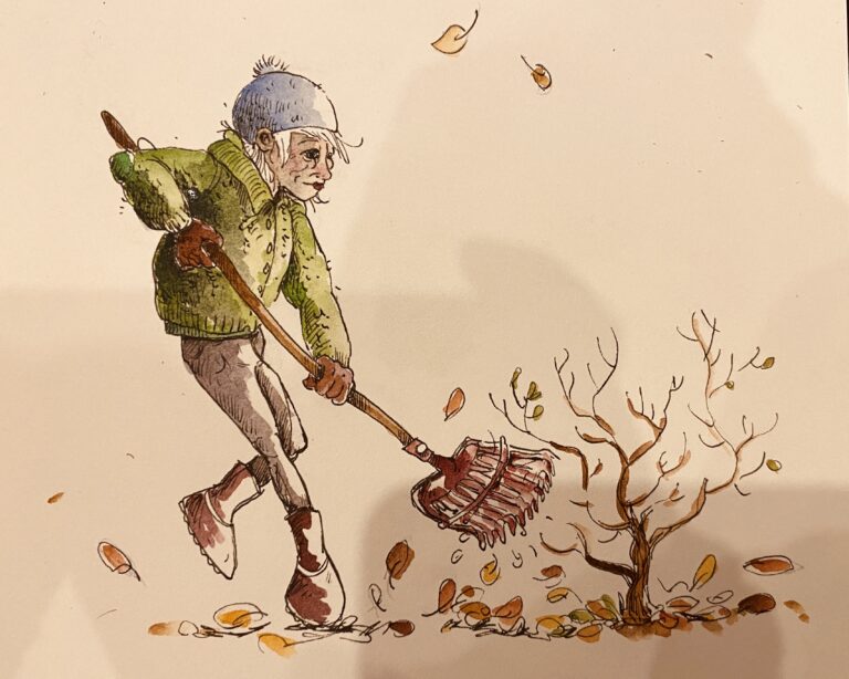 Un petit coup de balayage pour nettoyer les chemins et protéger les arbustes des nuits fraiches propres à la fin de l’automne. Habillement. Sacrée madame Lorgnet. Inspirée d’un texte de Sergio Salma. 15 Nov 2025